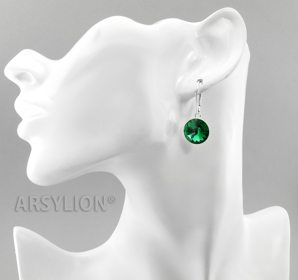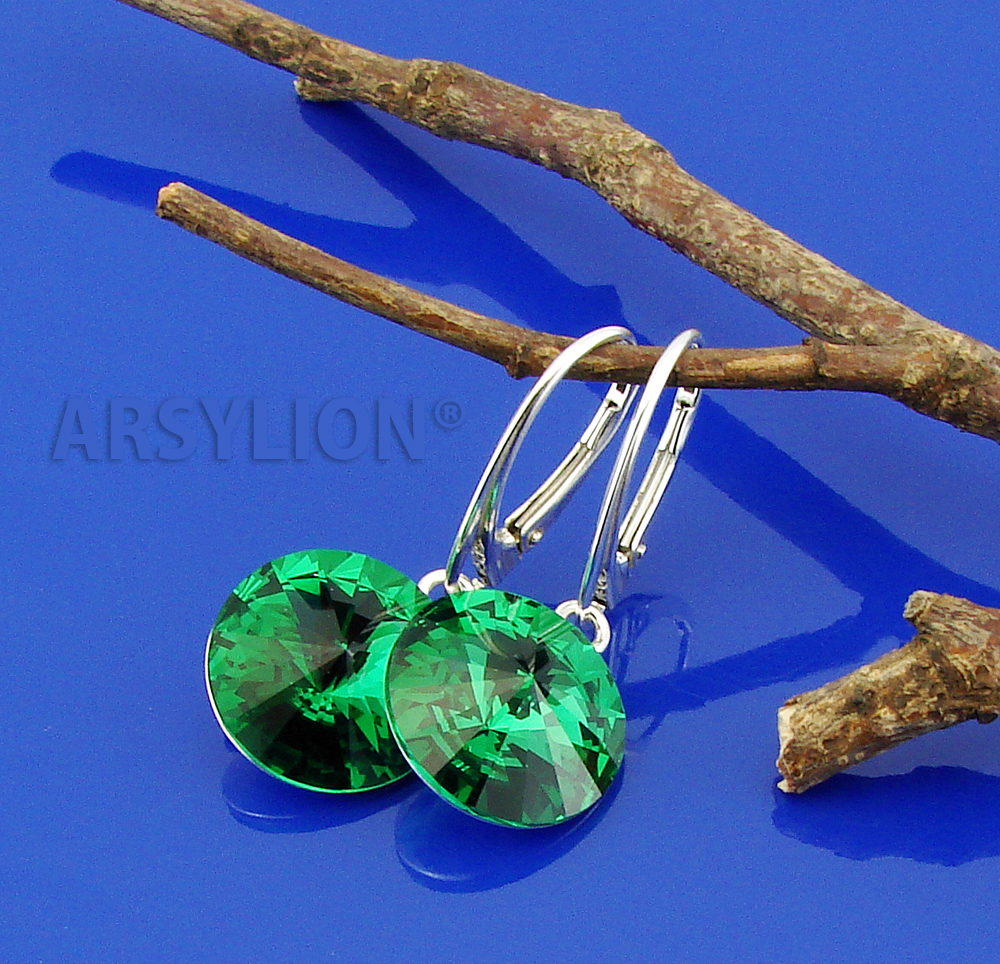 - materiał: wysokiej jakości austriackie kryształy 14mm rivoli Crystal Majestic Green, pozostałe elementy kolczyków wykonane ze srebra próby 925, wybita próba